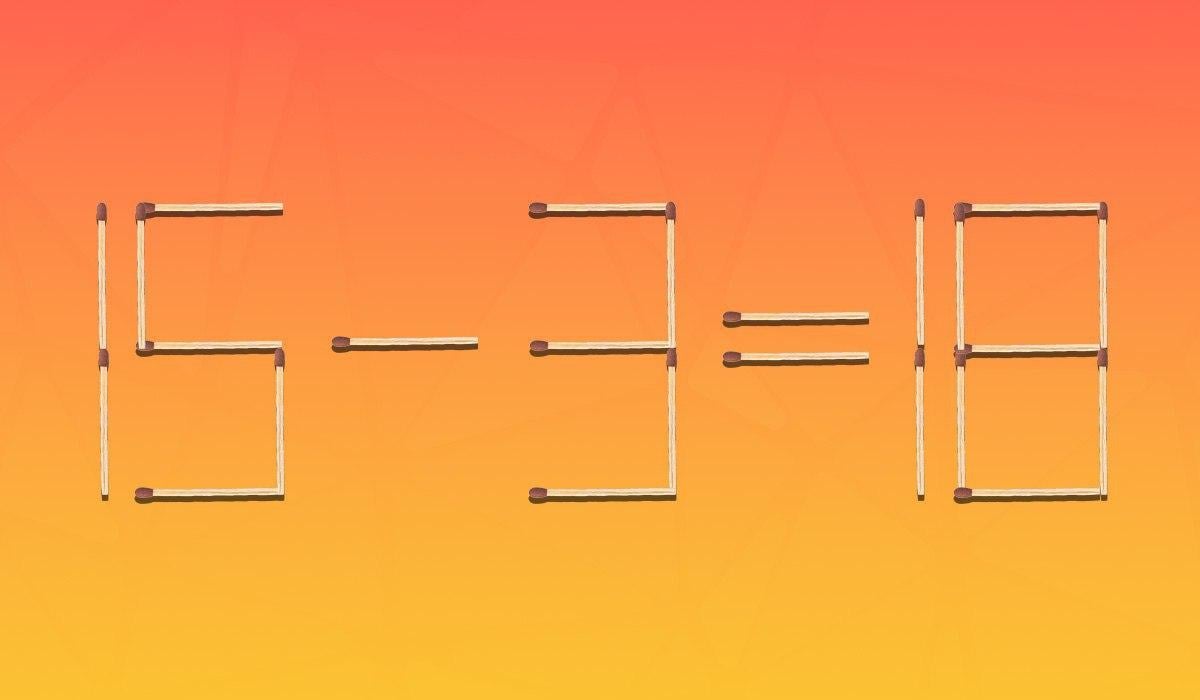 Před vámi je nesprávná matematická rovnice 15 – 3 = 18, složená z 24 zápalek. Úkolem je změnit příklad tak, aby se stal logicky správným přesunutím pouze jedné zápalky. K tomu se musíte soustředit a podívat se na čísla z jiného úhlu.