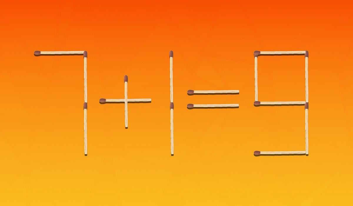 Níže uvidíte obrázek, na kterém je rovnost 7+1=9 rozložena pomocí zápalek. Je zřejmé, že je to matematicky nesprávné a je třeba to opravit tak, že z 15 zápalek přesunete pouze dvě.