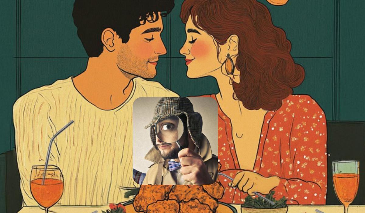 Před vámi stojí zamilovaný muž a zamilovaná žena, kteří si příjemně povídají při romantické večeři. Dívka je oblečena do elegantních šatů a muž do lehkého svetříku. Na stole vidíte skleničky s nápoji a několik chutných pokrmů. Na stěnách podniku visí obrazy a ze stropu jsou zavěšeny žárovky.