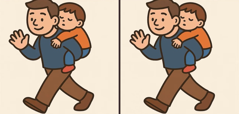 Tak co, jste připraveni na další výzvu? Podívejte se pozorně na dva obrázky muže, který nese na zádech dítě. Na první pohled mohou vypadat stejně, ale jsou mezi nimi tři malé rozdíly. Myslíte si, že je všechny najdete za 19 sekund? Zkuste to a otestujte svou ostrost zraku!